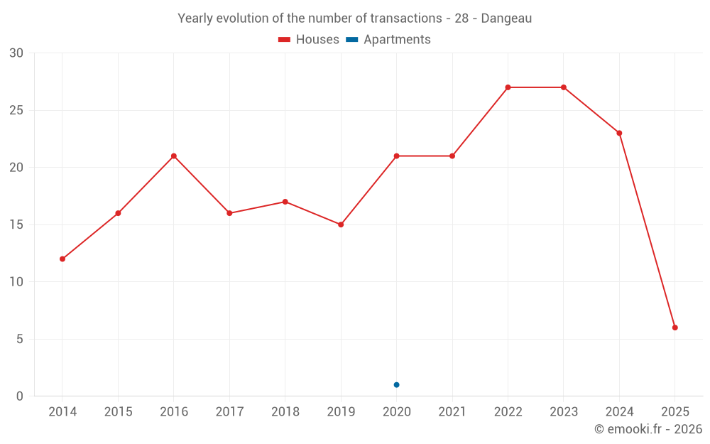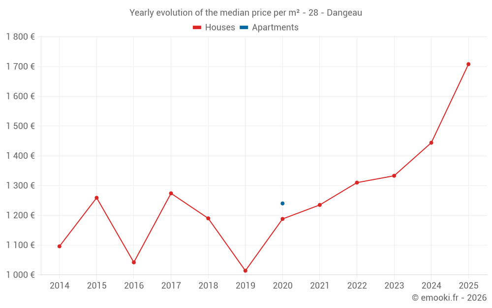 The median price on the 44 house transactions of the last 24 months in the municipality of Dangeau was 1 490 € per square meter for a median property value of 112 075 €. Over this period, 60% of transactions were between 886 and 1 878 € per square meter (from the 2nd to the 8th deciles).