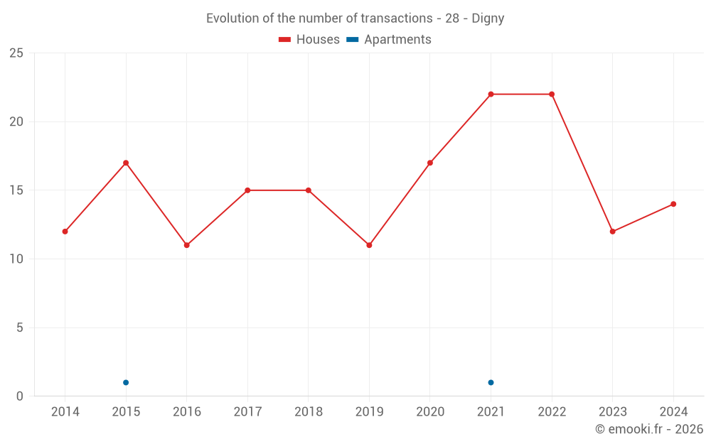 The median price on the 19 house transactions of the last 24 months in the municipality of Digny was 1 287 € per square meter for a median property value of 148 000 €. Over this period, 60% of transactions were between 924 and 1 782 € per square meter (from the 2nd to the 8th deciles).