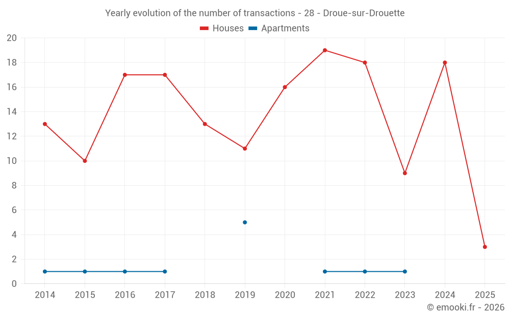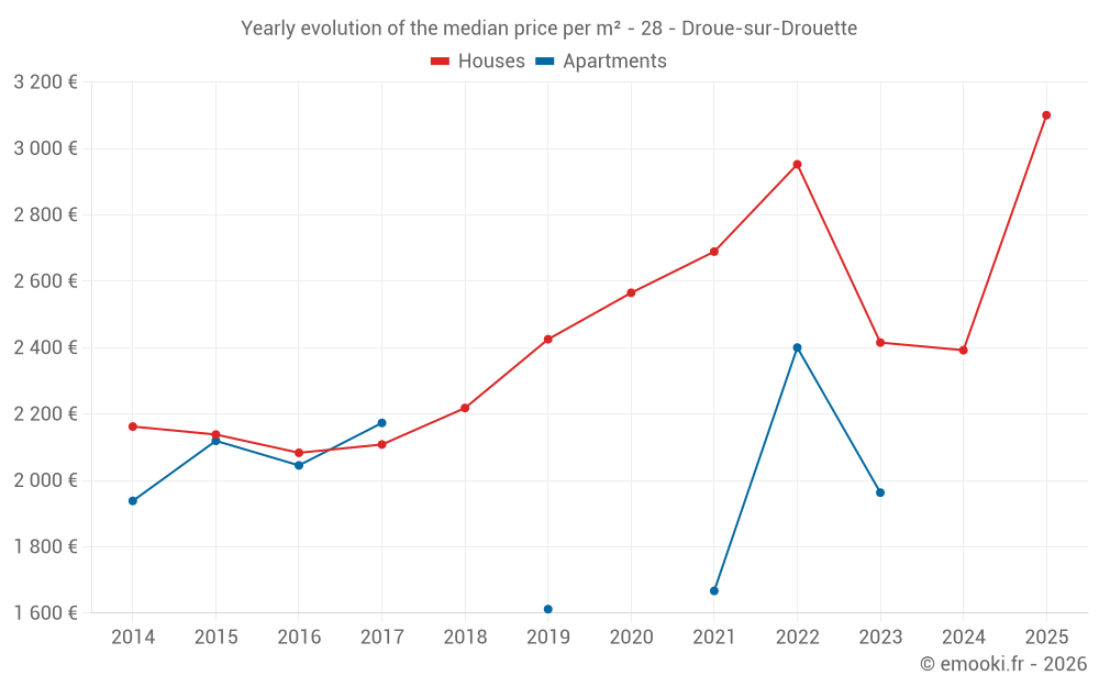 The median price on the 25 house transactions of the last 24 months in the municipality of Droue-sur-Drouette was 2 449 € per square meter for a median property value of 310 000 €. Over this period, 60% of transactions were between 2 072 and 3 113 € per square meter (from the 2nd to the 8th deciles).