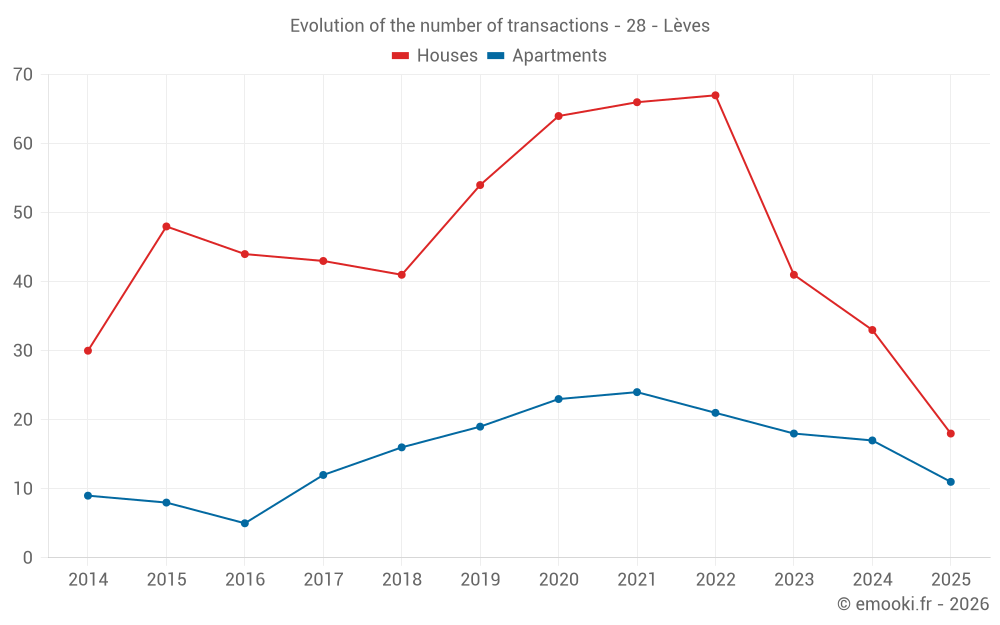 The median price on the 18 house transactions of the last 6 months in the municipality of Lèves was 2 278 € per square meter for a median property value of 215 170 €. Over this period, 60% of transactions were between 1 592 and 3 032 € per square meter (from the 2nd to the 8th deciles).
