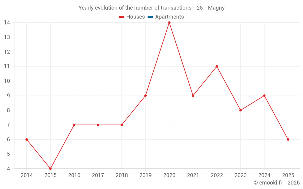 The median price on the 17 house transactions of the last 24 months in the municipality of Magny was 1 855 € per square meter for a median property value of 165 550 €. Over this period, 60% of transactions were between 1 573 and 2 065 € per square meter (from the 2nd to the 8th deciles).