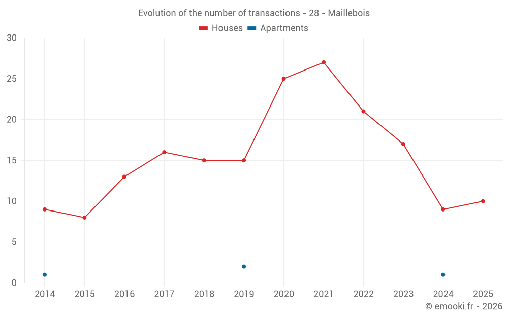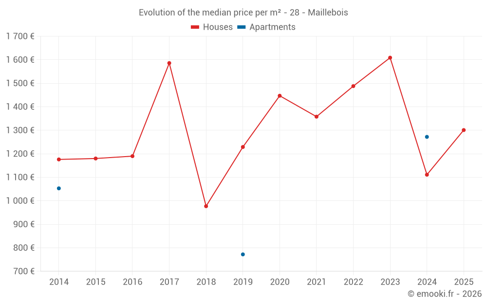 The median price on the 28 house transactions of the last 24 months in the municipality of Maillebois was 1 548 € per square meter for a median property value of 140 000 €. Over this period, 60% of transactions were between 885 and 1 983 € per square meter (from the 2nd to the 8th deciles).