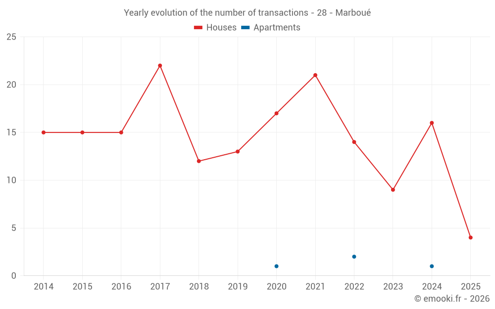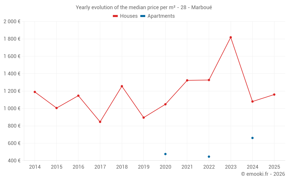 The median price on the 23 house transactions of the last 24 months in the municipality of Marboué was 1 088 € per square meter for a median property value of 97 500 €. Over this period, 60% of transactions were between 758 and 1 655 € per square meter (from the 2nd to the 8th deciles).