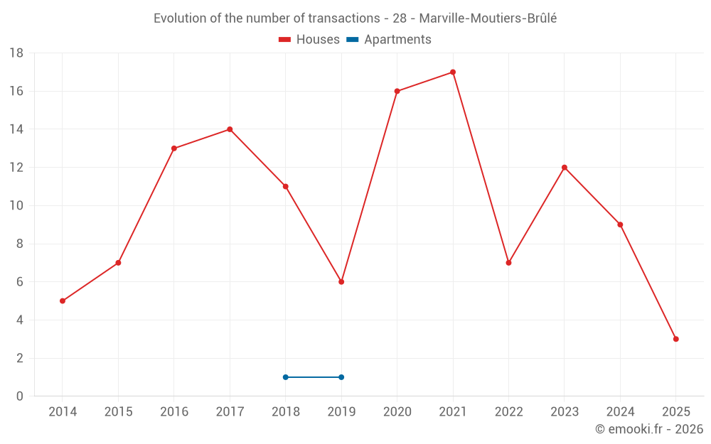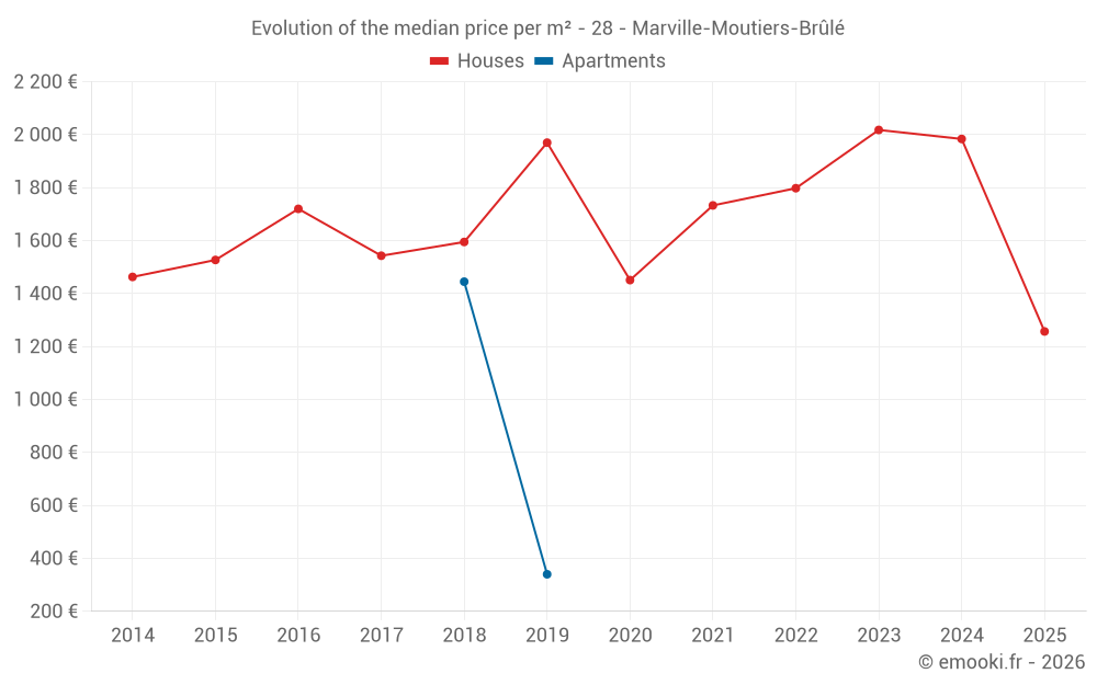 The median price on the 18 house transactions of the last 24 months in the municipality of Marville-Moutiers-Brûlé was 1 892 € per square meter for a median property value of 211 250 €. Over this period, 60% of transactions were between 1 517 and 2 169 € per square meter (from the 2nd to the 8th deciles).