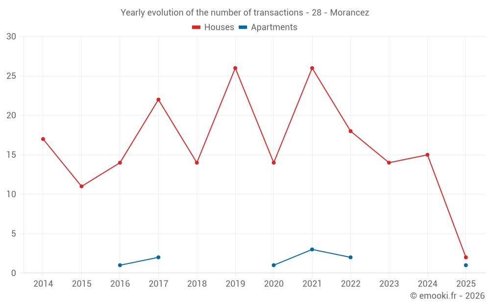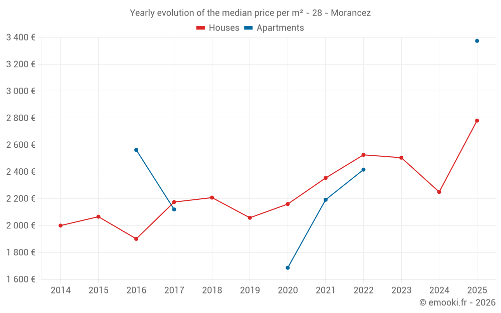 The median price on the 25 house transactions of the last 24 months in the municipality of Morancez was 2 305 € per square meter for a median property value of 240 000 €. Over this period, 60% of transactions were between 1 985 and 2 682 € per square meter (from the 2nd to the 8th deciles).