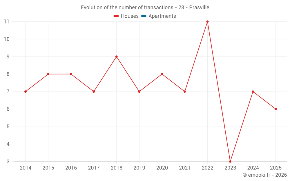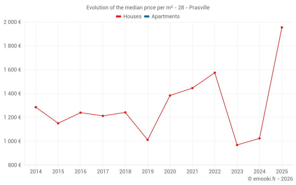 The median price on the 14 house transactions of the last 24 months in the municipality of Prasville was 1 258 € per square meter for a median property value of 143 000 €. Over this period, 60% of transactions were between 932 and 1 974 € per square meter (from the 2nd to the 8th deciles).