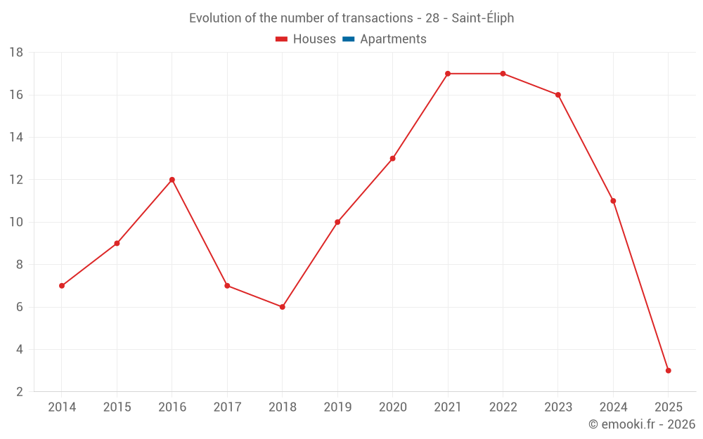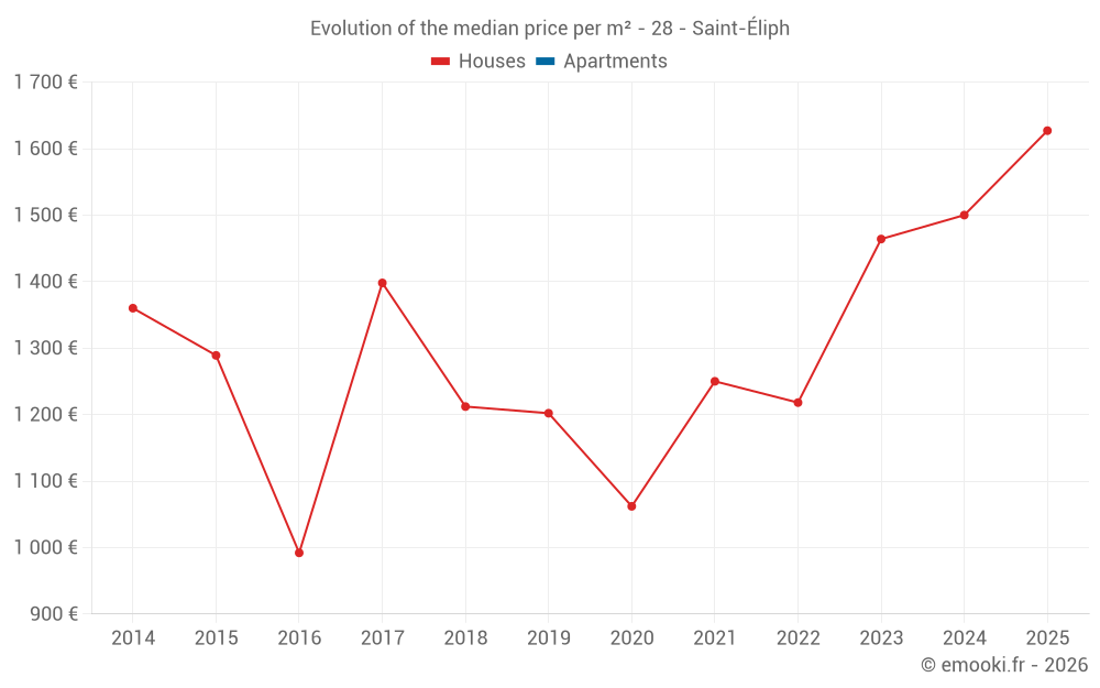 The median price on the 22 house transactions of the last 24 months in the municipality of Saint-Éliph was 1 542 € per square meter for a median property value of 131 700 €. Over this period, 60% of transactions were between 1 118 and 2 055 € per square meter (from the 2nd to the 8th deciles).