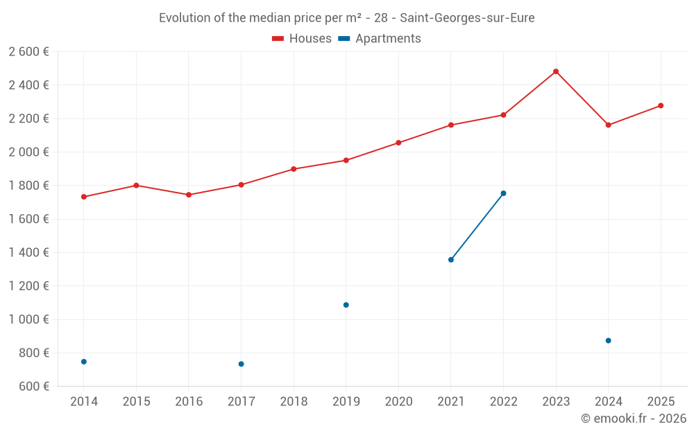 The median price on the 25 house transactions of the last 12 months in the municipality of Saint-Georges-sur-Eure was 2 184 € per square meter for a median property value of 226 500 €. Over this period, 60% of transactions were between 1 843 and 2 642 € per square meter (from the 2nd to the 8th deciles).