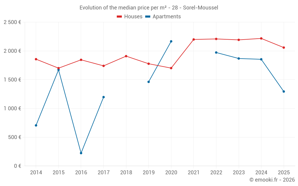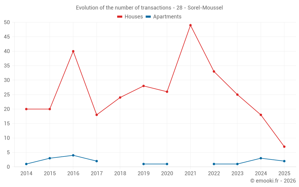 The median price on the 16 house transactions of the last 12 months in the municipality of Sorel-Moussel was 2 218 € per square meter for a median property value of 248 050 €. Over this period, 60% of transactions were between 1 686 and 2 425 € per square meter (from the 2nd to the 8th deciles).