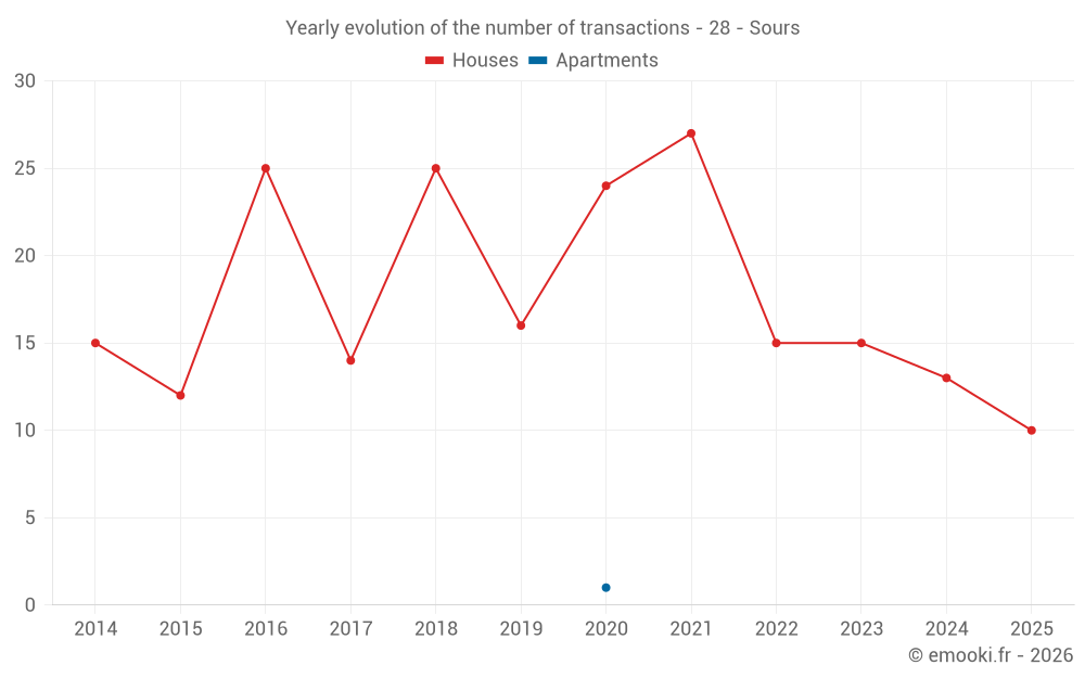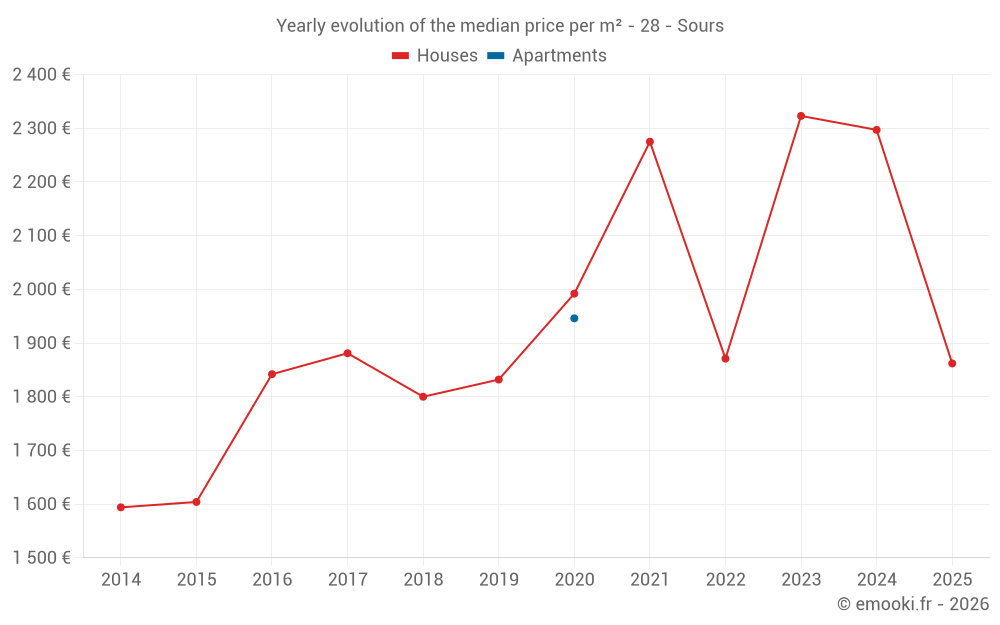 The median price on the 20 house transactions of the last 12 months in the municipality of Sours was 2 222 € per square meter for a median property value of 192 500 €. Over this period, 60% of transactions were between 1 650 and 2 544 € per square meter (from the 2nd to the 8th deciles).