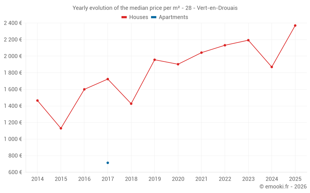 The median price on the 20 house transactions of the last 24 months in the municipality of Vert-en-Drouais was 2 095 € per square meter for a median property value of 201 775 €. Over this period, 60% of transactions were between 1 633 and 2 378 € per square meter (from the 2nd to the 8th deciles).