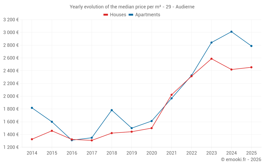 The median price on the 18 apartment transactions of the last 12 months in the municipality of Audierne was 2 749 € per square meter for a median property value of 121 576 €. Over this period, 60% of transactions were between 2 416 and 3 685 € per square meter (from the 2nd to the 8th deciles).
