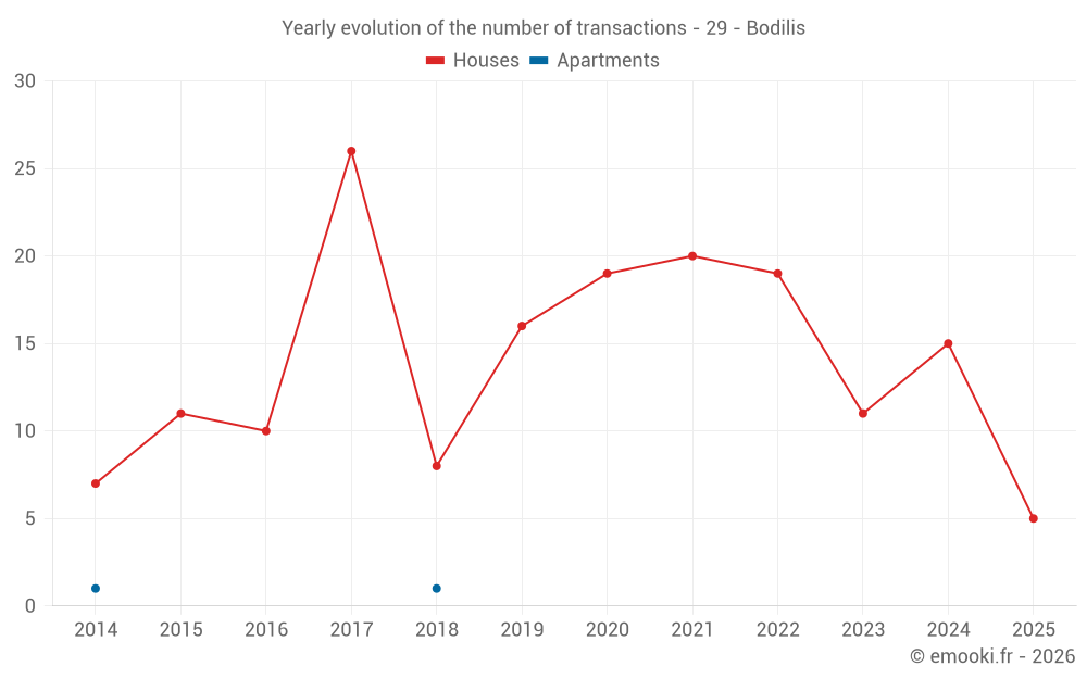 The median price on the 20 house transactions of the last 24 months in the municipality of Bodilis was 1 528 € per square meter for a median property value of 185 958 €. Over this period, 60% of transactions were between 1 083 and 1 924 € per square meter (from the 2nd to the 8th deciles).
