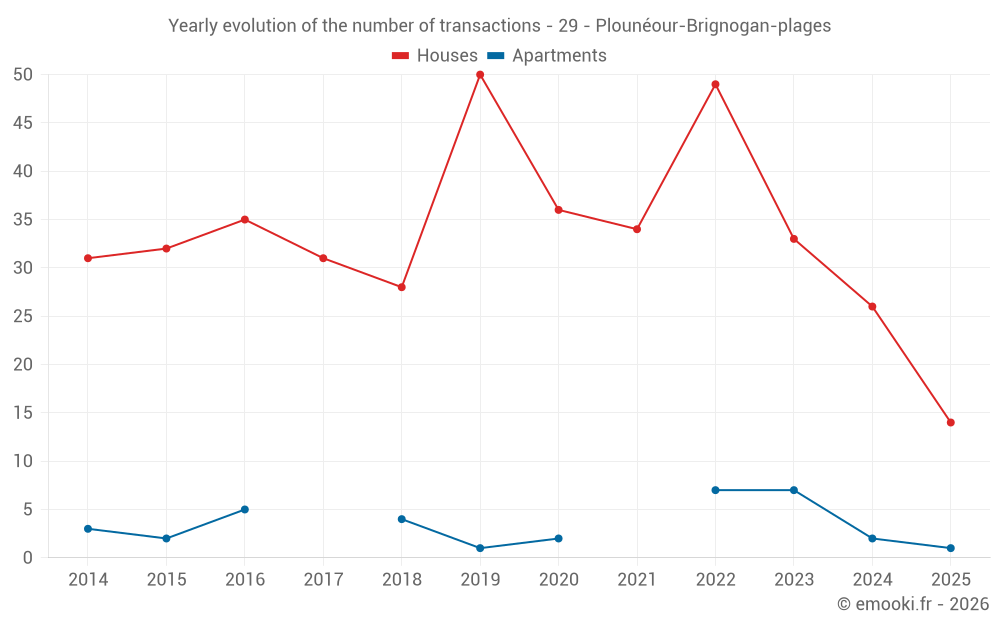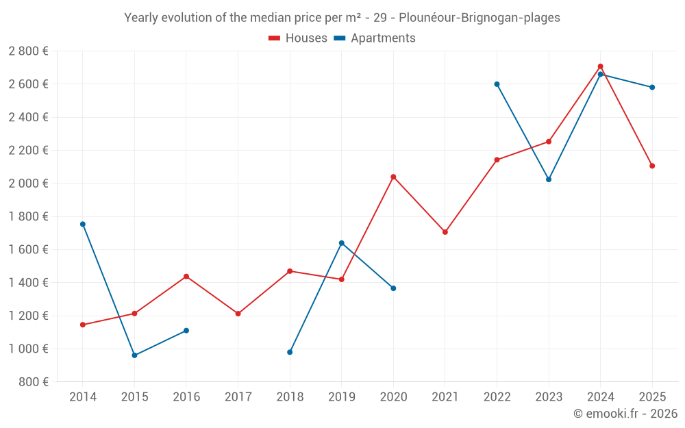 The median price on the 28 house transactions of the last 12 months in the municipality of Plounéour-Brignogan-plages was 1 988 € per square meter for a median property value of 192 500 €. Over this period, 60% of transactions were between 1 507 and 2 778 € per square meter (from the 2nd to the 8th deciles).