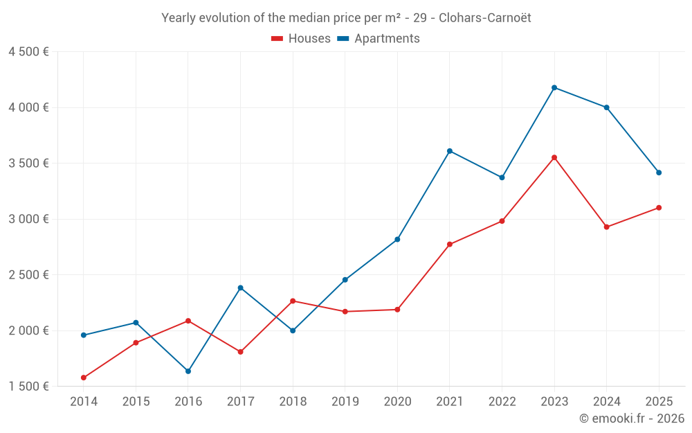 The median price on the 25 house transactions of the last 6 months in the municipality of Clohars-Carnoët was 3 102 € per square meter for a median property value of 340 000 €. Over this period, 60% of transactions were between 2 285 and 3 918 € per square meter (from the 2nd to the 8th deciles).
