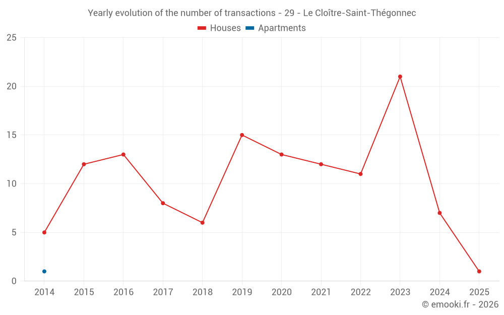 The median price on the 20 house transactions of the last 24 months in the municipality of Le Cloître-Saint-Thégonnec was 1 478 € per square meter for a median property value of 105 600 €. Over this period, 60% of transactions were between 1 111 and 1 841 € per square meter (from the 2nd to the 8th deciles).