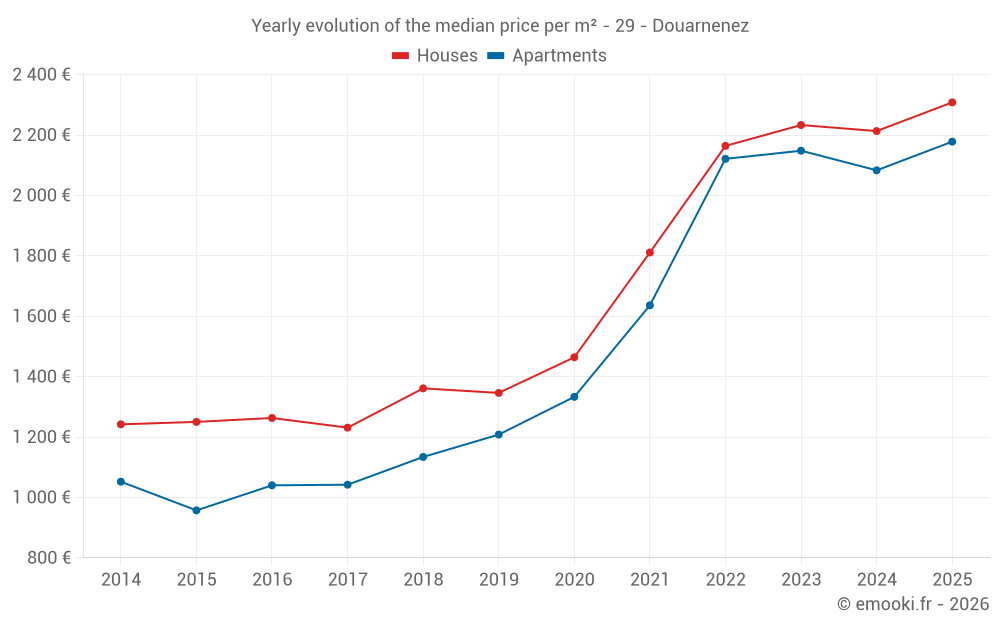 The median price on the 47 house transactions of the last 6 months in the municipality of Douarnenez was 2 308 € per square meter for a median property value of 199 000 €. Over this period, 60% of transactions were between 1 562 and 2 841 € per square meter (from the 2nd to the 8th deciles).