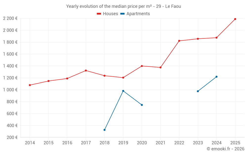 The median price on the 16 house transactions of the last 12 months in the municipality of Le Faou was 2 046 € per square meter for a median property value of 180 000 €. Over this period, 60% of transactions were between 1 857 and 2 292 € per square meter (from the 2nd to the 8th deciles).