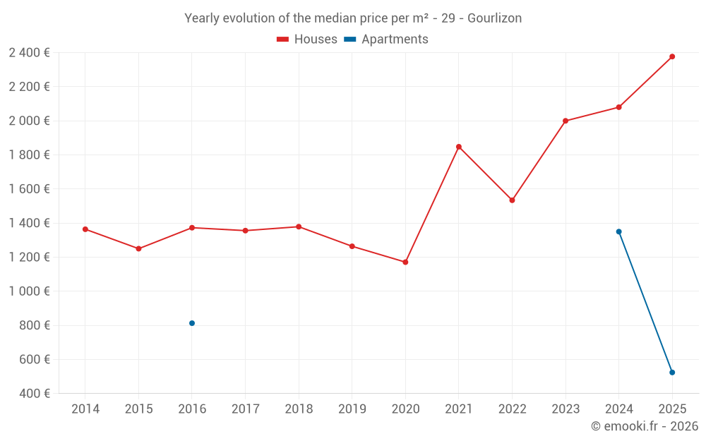 The median price on the 19 house transactions of the last 24 months in the municipality of Gourlizon was 2 192 € per square meter for a median property value of 203 500 €. Over this period, 60% of transactions were between 1 468 and 2 542 € per square meter (from the 2nd to the 8th deciles).