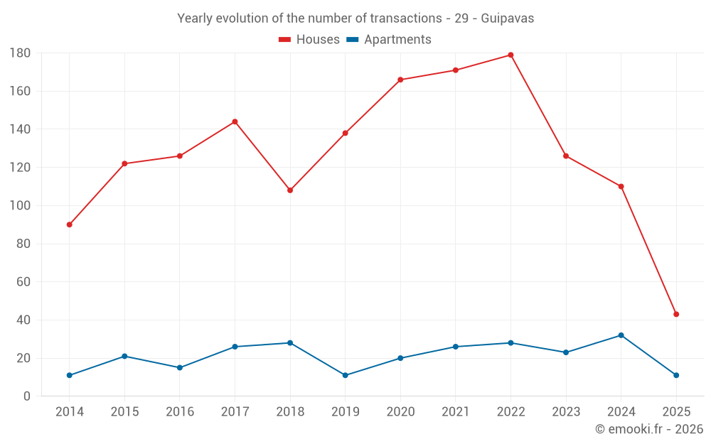 The median price on the 43 house transactions of the last 6 months in the municipality of Guipavas was 2 385 € per square meter for a median property value of 264 000 €. Over this period, 60% of transactions were between 2 060 and 3 094 € per square meter (from the 2nd to the 8th deciles).