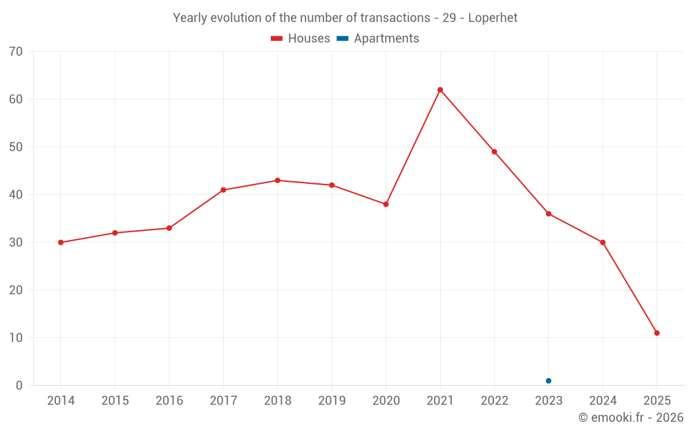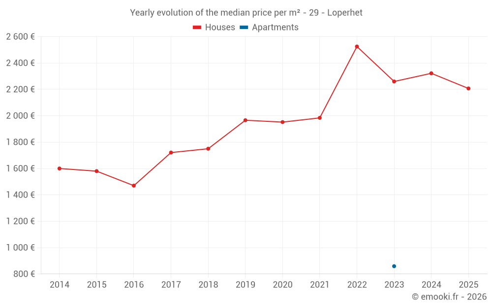 The median price on the 35 house transactions of the last 12 months in the municipality of Loperhet was 2 207 € per square meter for a median property value of 215 100 €. Over this period, 60% of transactions were between 1 420 and 2 575 € per square meter (from the 2nd to the 8th deciles).