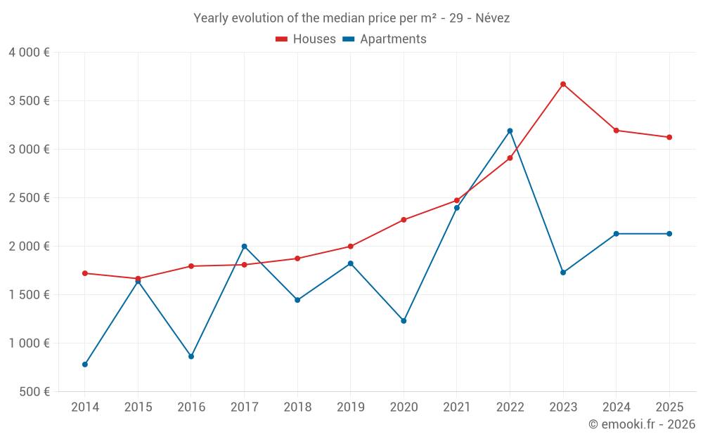 The median price on the 34 house transactions of the last 12 months in the municipality of Névez was 3 146 € per square meter for a median property value of 302 500 €. Over this period, 60% of transactions were between 2 466 and 3 934 € per square meter (from the 2nd to the 8th deciles).