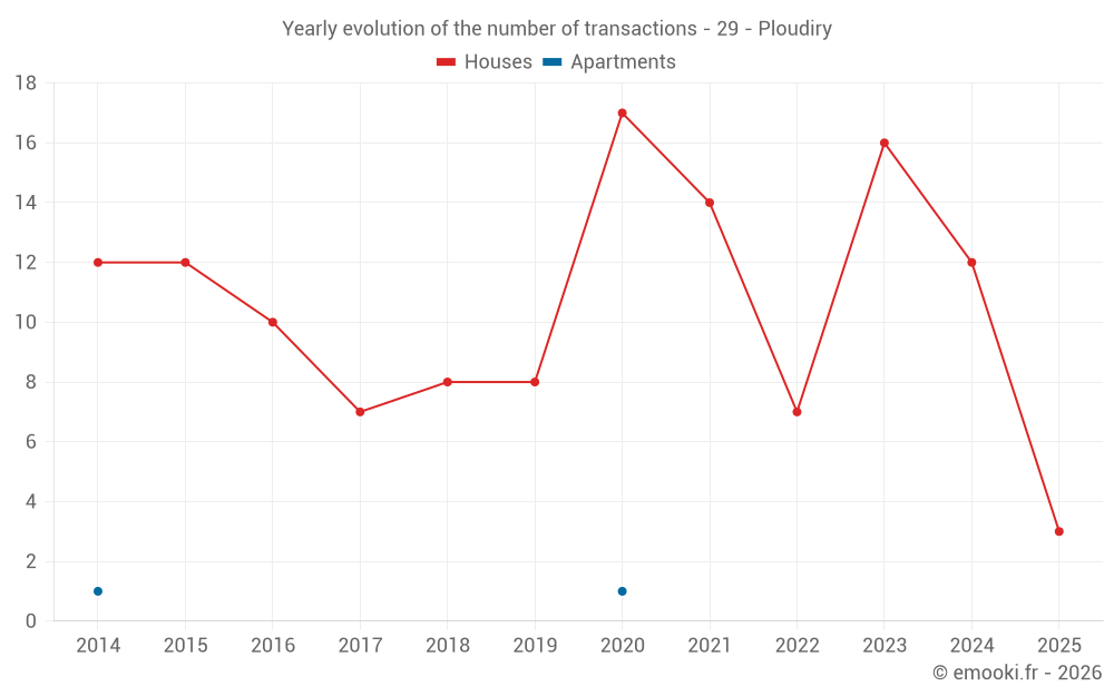 The median price on the 26 house transactions of the last 24 months in the municipality of Ploudiry was 2 075 € per square meter for a median property value of 181 500 €. Over this period, 60% of transactions were between 1 648 and 2 440 € per square meter (from the 2nd to the 8th deciles).