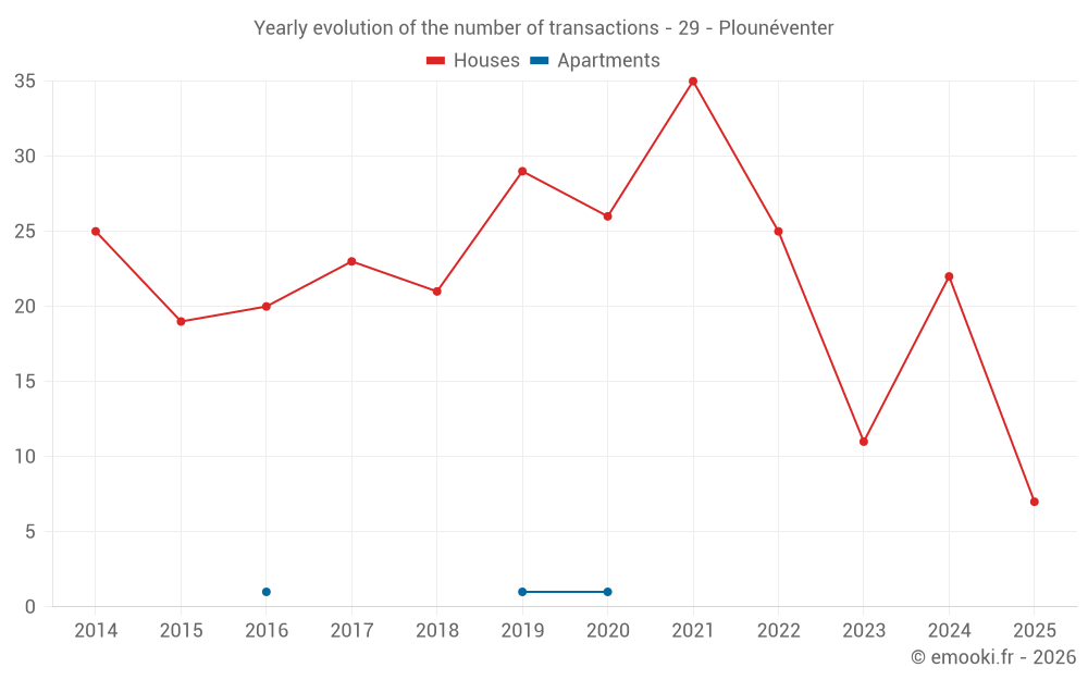 The median price on the 20 house transactions of the last 12 months in the municipality of Plounéventer was 1 740 € per square meter for a median property value of 202 500 €. Over this period, 60% of transactions were between 962 and 2 248 € per square meter (from the 2nd to the 8th deciles).