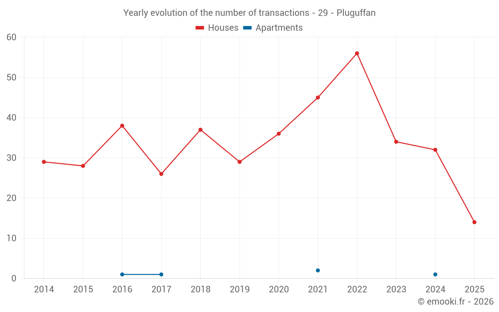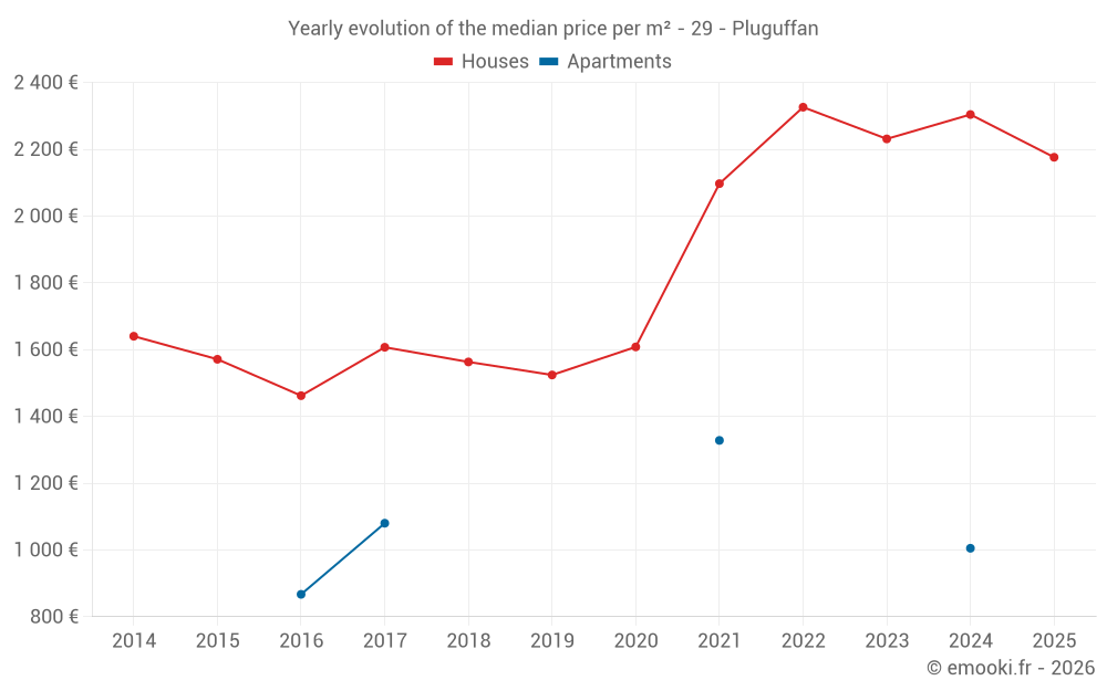 The median price on the 31 house transactions of the last 12 months in the municipality of Pluguffan was 2 388 € per square meter for a median property value of 210 813 €. Over this period, 60% of transactions were between 1 429 and 2 895 € per square meter (from the 2nd to the 8th deciles).