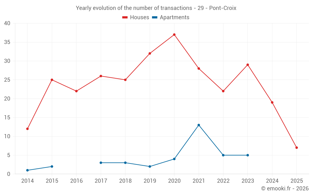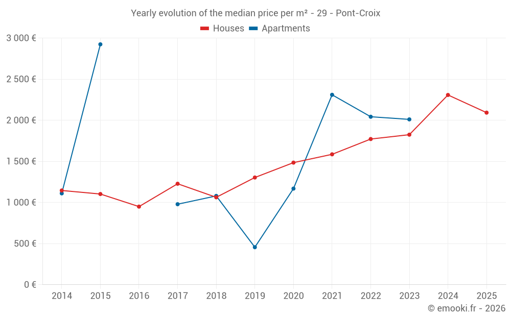 The median price on the 22 house transactions of the last 12 months in the municipality of Pont-Croix was 2 191 € per square meter for a median property value of 185 750 €. Over this period, 60% of transactions were between 1 869 and 2 544 € per square meter (from the 2nd to the 8th deciles).