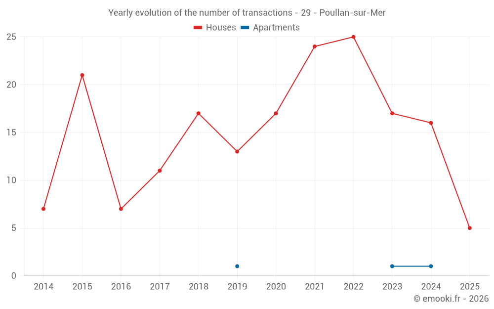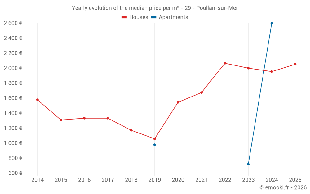 The median price on the 27 house transactions of the last 24 months in the municipality of Poullan-sur-Mer was 2 000 € per square meter for a median property value of 200 000 €. Over this period, 60% of transactions were between 1 209 and 2 866 € per square meter (from the 2nd to the 8th deciles).