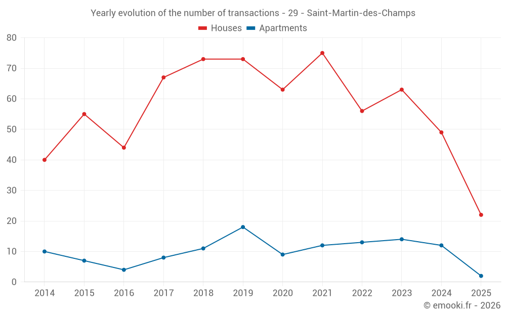 The median price on the 22 house transactions of the last 6 months in the municipality of Saint-Martin-des-Champs was 1 594 € per square meter for a median property value of 145 050 €. Over this period, 60% of transactions were between 1 218 and 2 328 € per square meter (from the 2nd to the 8th deciles).