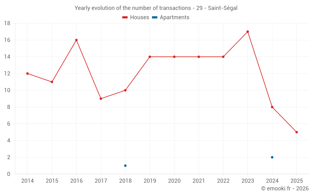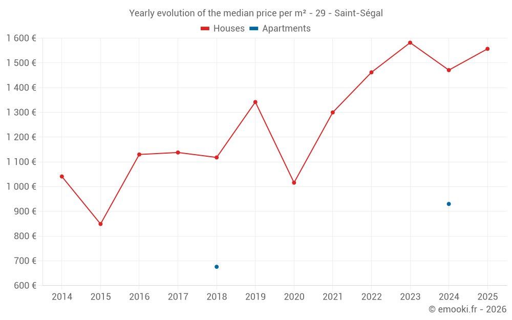 The median price on the 25 house transactions of the last 24 months in the municipality of Saint-Ségal was 1 569 € per square meter for a median property value of 150 000 €. Over this period, 60% of transactions were between 749 and 2 278 € per square meter (from the 2nd to the 8th deciles).