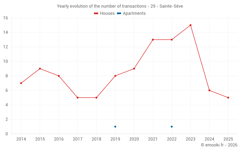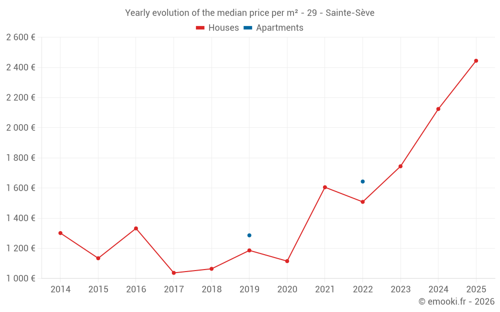 The median price on the 16 house transactions of the last 24 months in the municipality of Sainte-Sève was 2 124 € per square meter for a median property value of 207 000 €. Over this period, 60% of transactions were between 1 694 and 2 506 € per square meter (from the 2nd to the 8th deciles).