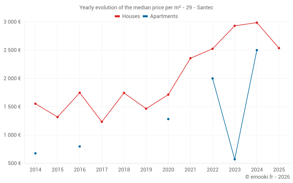 The median price on the 23 house transactions of the last 12 months in the municipality of Santec was 2 811 € per square meter for a median property value of 237 100 €. Over this period, 60% of transactions were between 2 190 and 3 671 € per square meter (from the 2nd to the 8th deciles).