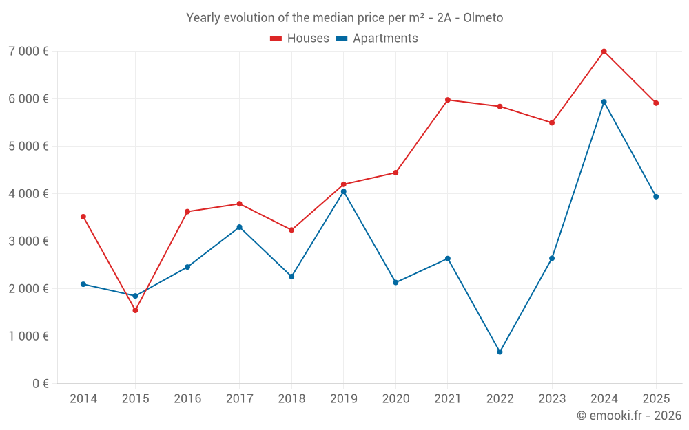 The median price on the 21 house transactions of the last 24 months in the municipality of Olmeto was 6 105 € per square meter for a median property value of 596 000 €. Over this period, 60% of transactions were between 2 361 and 8 133 € per square meter (from the 2nd to the 8th deciles).
