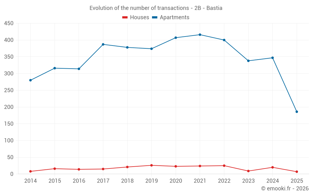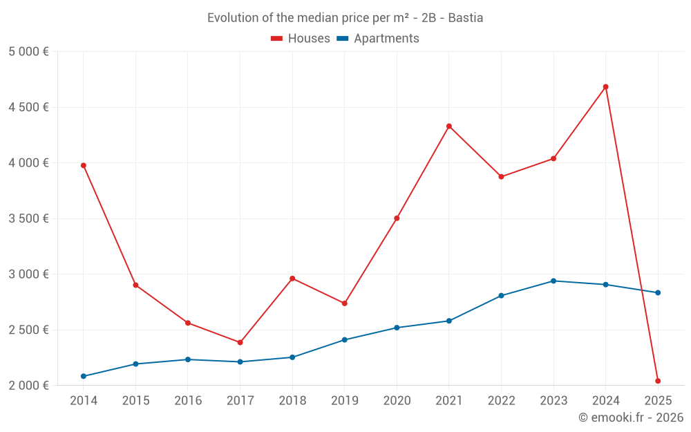 The median price on the 16 house transactions of the last 12 months in the municipality of Bastia was 3 138 € per square meter for a median property value of 378 780 €. Over this period, 60% of transactions were between 1 500 and 4 700 € per square meter (from the 2nd to the 8th deciles).