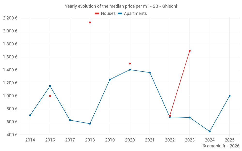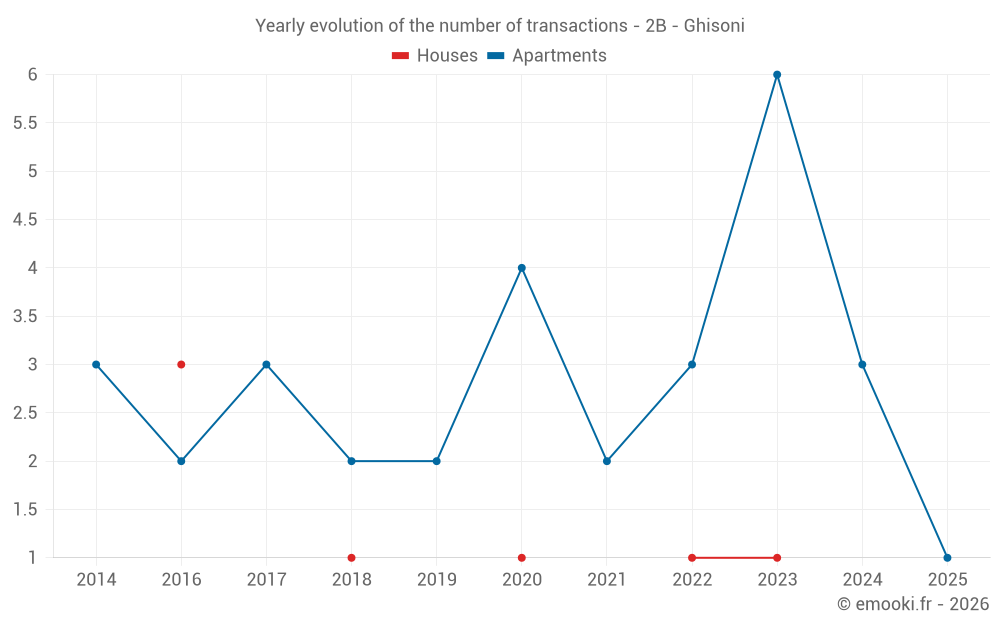Real estate price map in the municipality of Ghisoni, choose a section to see transactions by parcel.