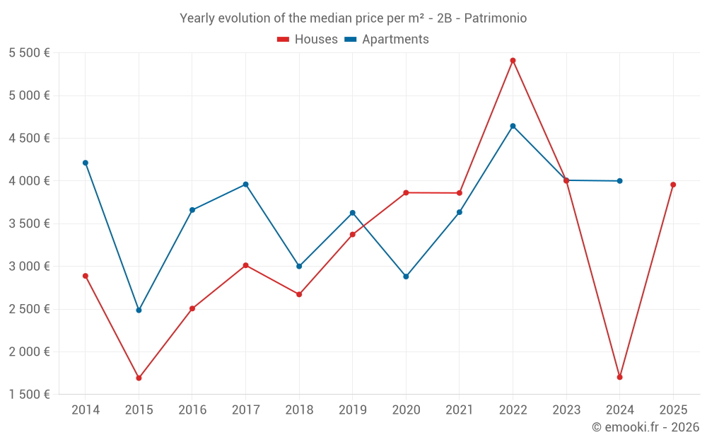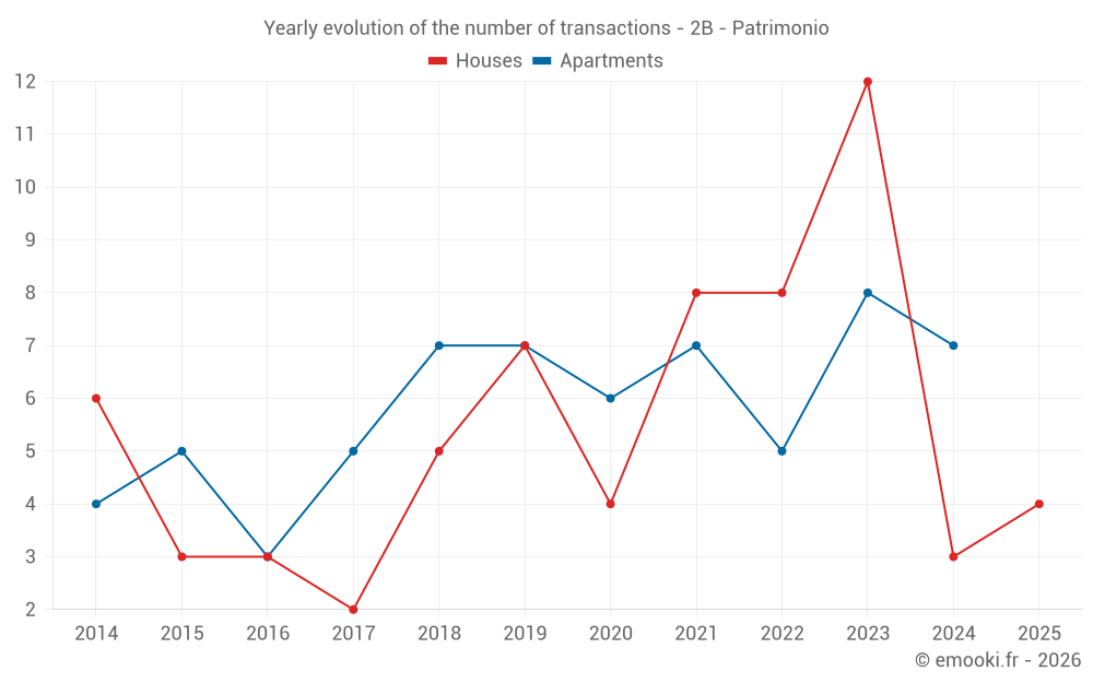 The median price on the 14 house transactions of the last 24 months in the municipality of Patrimonio was 3 780 € per square meter for a median property value of 285 470 €. Over this period, 60% of transactions were between 1 651 and 4 499 € per square meter (from the 2nd to the 8th deciles).