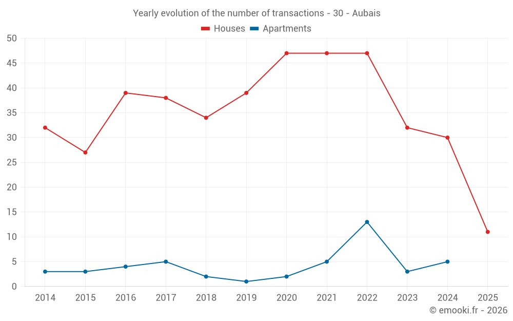 The median price on the 27 house transactions of the last 12 months in the municipality of Aubais was 3 242 € per square meter for a median property value of 398 520 €. Over this period, 60% of transactions were between 2 486 and 3 956 € per square meter (from the 2nd to the 8th deciles).