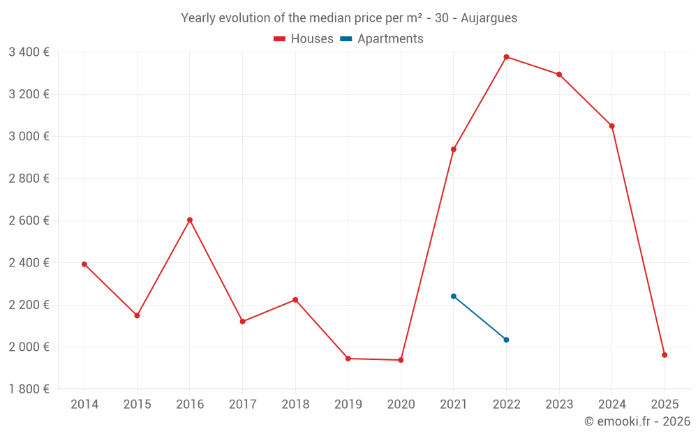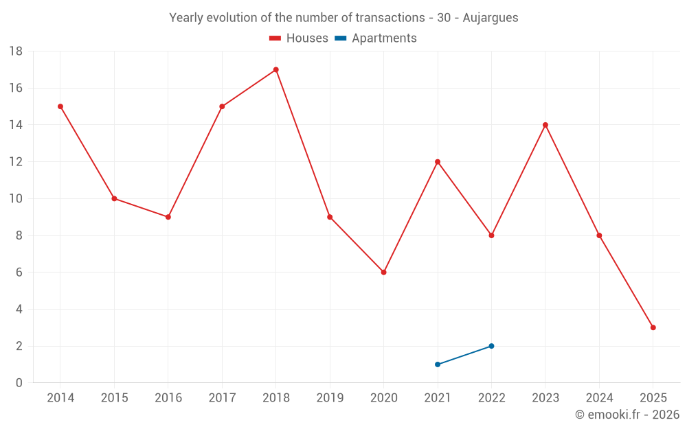 The median price on the 18 house transactions of the last 24 months in the municipality of Aujargues was 3 222 € per square meter for a median property value of 306 000 €. Over this period, 60% of transactions were between 2 261 and 3 868 € per square meter (from the 2nd to the 8th deciles).