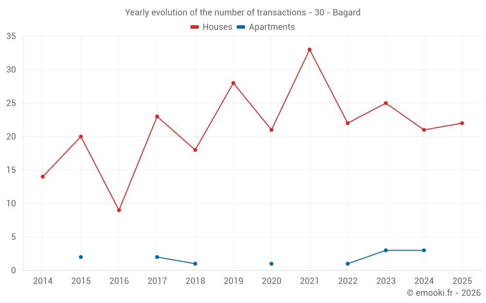 The median price on the 22 house transactions of the last 12 months in the municipality of Bagard was 2 320 € per square meter for a median property value of 247 450 €. Over this period, 60% of transactions were between 1 995 and 2 897 € per square meter (from the 2nd to the 8th deciles).