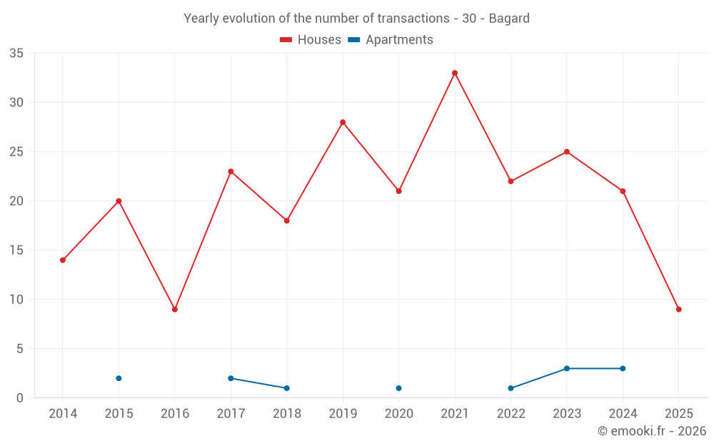 The median price on the 19 house transactions of the last 12 months in the municipality of Bagard was 2 307 € per square meter for a median property value of 260 000 €. Over this period, 60% of transactions were between 1 962 and 2 884 € per square meter (from the 2nd to the 8th deciles).
