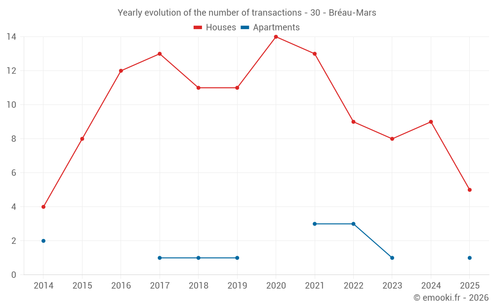 The median price on the 18 house transactions of the last 24 months in the municipality of Bréau-Mars was 1 912 € per square meter for a median property value of 152 000 €. Over this period, 60% of transactions were between 1 208 and 2 288 € per square meter (from the 2nd to the 8th deciles).