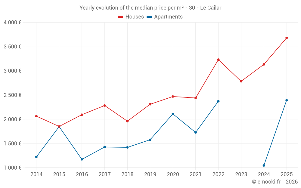 The median price on the 21 house transactions of the last 12 months in the municipality of Le Cailar was 3 254 € per square meter for a median property value of 310 000 €. Over this period, 60% of transactions were between 2 444 and 3 736 € per square meter (from the 2nd to the 8th deciles).