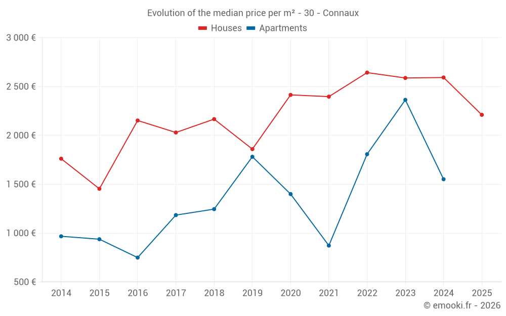 The median price on the 19 house transactions of the last 12 months in the municipality of Connaux was 2 592 € per square meter for a median property value of 205 000 €. Over this period, 60% of transactions were between 1 676 and 3 276 € per square meter (from the 2nd to the 8th deciles).