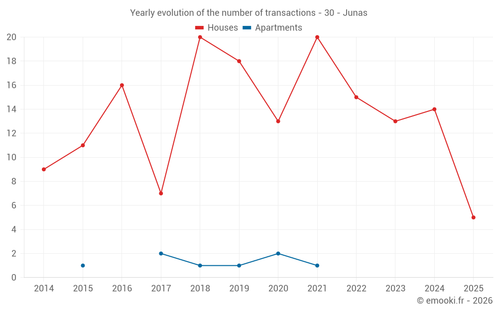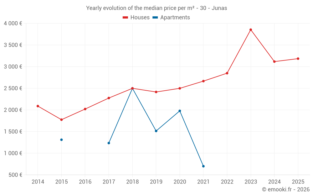 The median price on the 25 house transactions of the last 24 months in the municipality of Junas was 3 149 € per square meter for a median property value of 306 200 €. Over this period, 60% of transactions were between 2 529 and 3 853 € per square meter (from the 2nd to the 8th deciles).