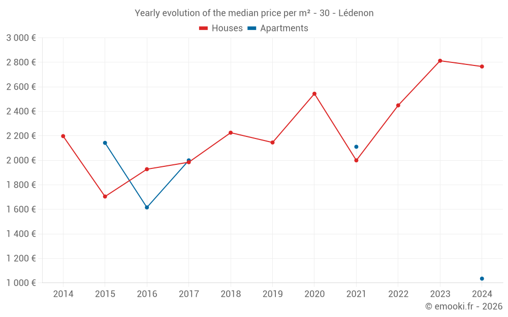 The median price on the 21 house transactions of the last 24 months in the municipality of Lédenon was 2 640 € per square meter for a median property value of 260 000 €. Over this period, 60% of transactions were between 1 736 and 2 837 € per square meter (from the 2nd to the 8th deciles).