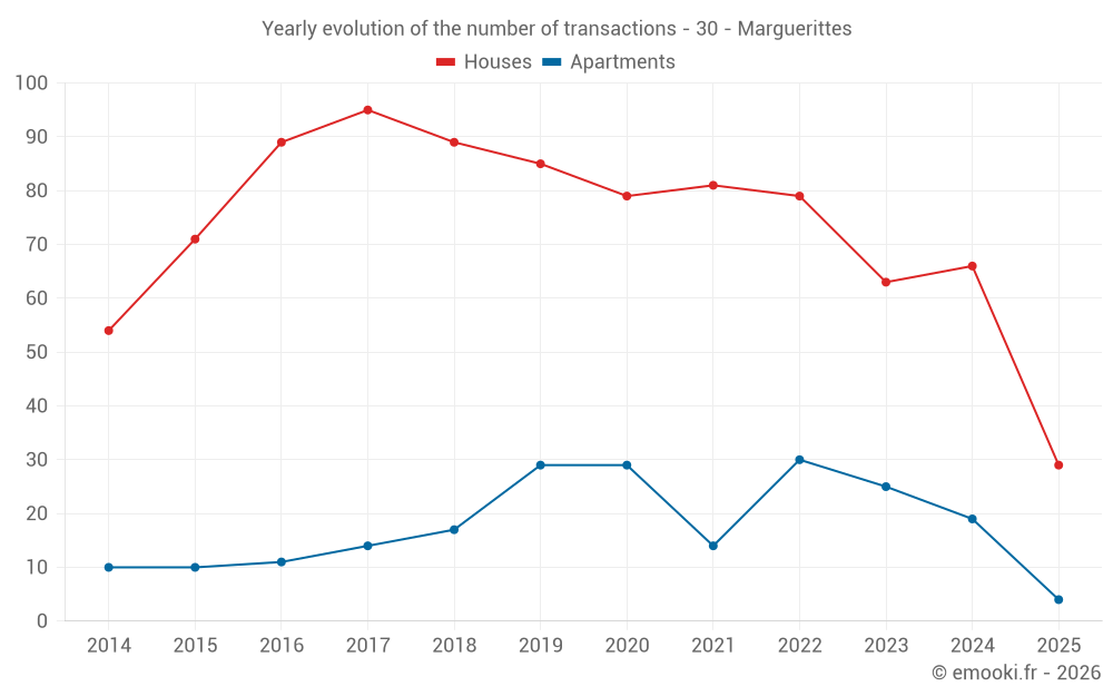 The median price on the 33 apartment transactions of the last 24 months in the municipality of Marguerittes was 2 217 € per square meter for a median property value of 145 000 €. Over this period, 60% of transactions were between 1 509 and 2 583 € per square meter (from the 2nd to the 8th deciles).