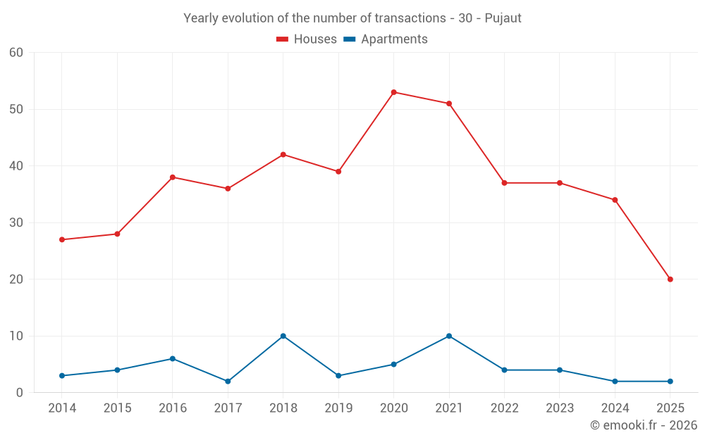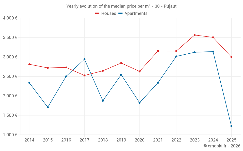 The median price on the 20 house transactions of the last 6 months in the municipality of Pujaut was 2 999 € per square meter for a median property value of 354 650 €. Over this period, 60% of transactions were between 2 266 and 3 964 € per square meter (from the 2nd to the 8th deciles).